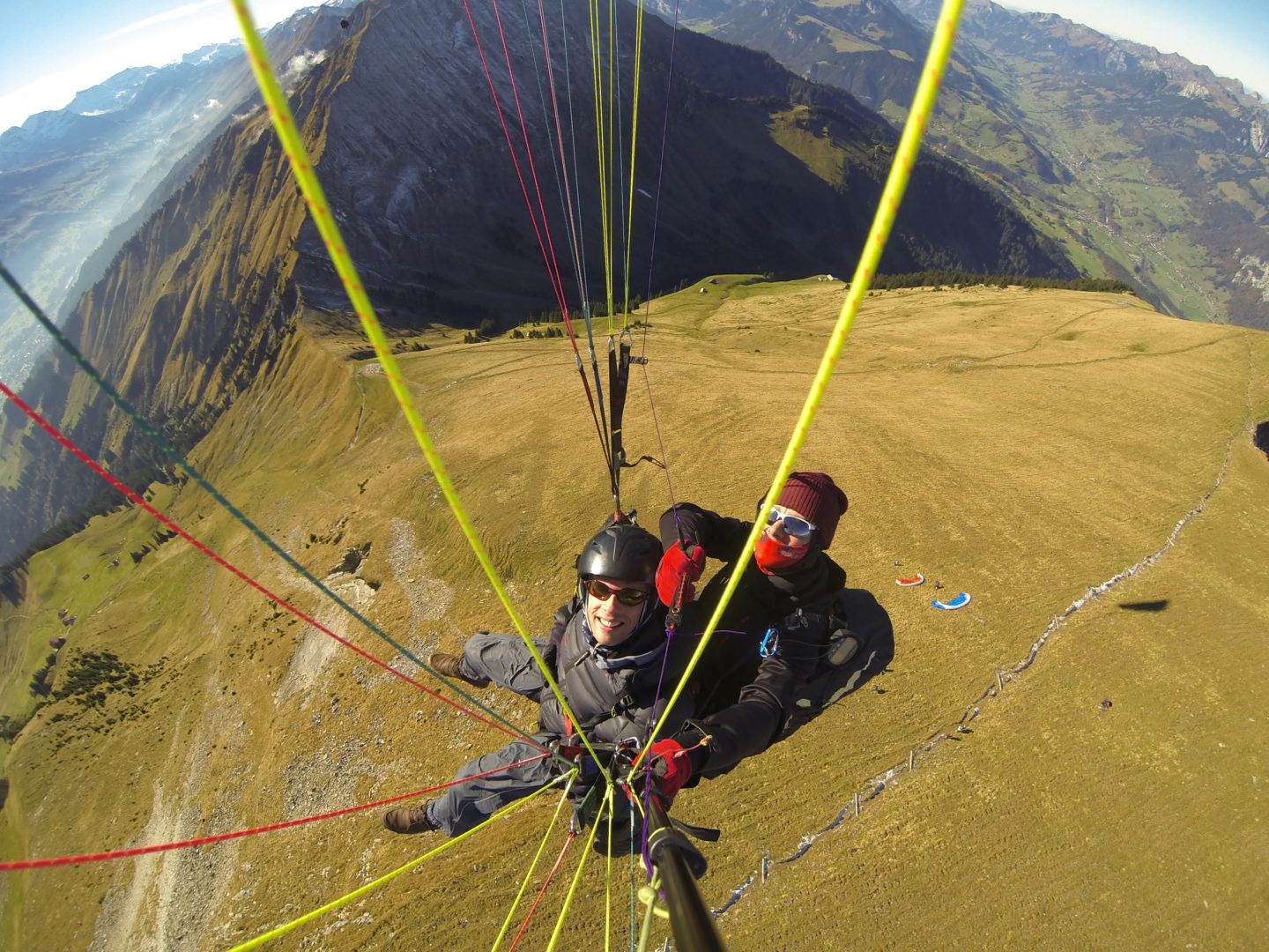 Der Niesenflug ist ein ganz spezielles Erlebnis. Auch gegen Ende der Saison, wenn keine Thermik mehr zu finden ist bietet der grosse Höhenunterschied die Möglichkeit für einen langen Gleitflug bis nach Spiez. Dazu kommt eine tolle Fernsicht und die herbstlichen Farben überall lassen sich aus sehen. Hier hatten wir sogar noch Glück und konnten vor dem Startplatz Soaren bis es uns zu kalt wurde in der Luft 😀