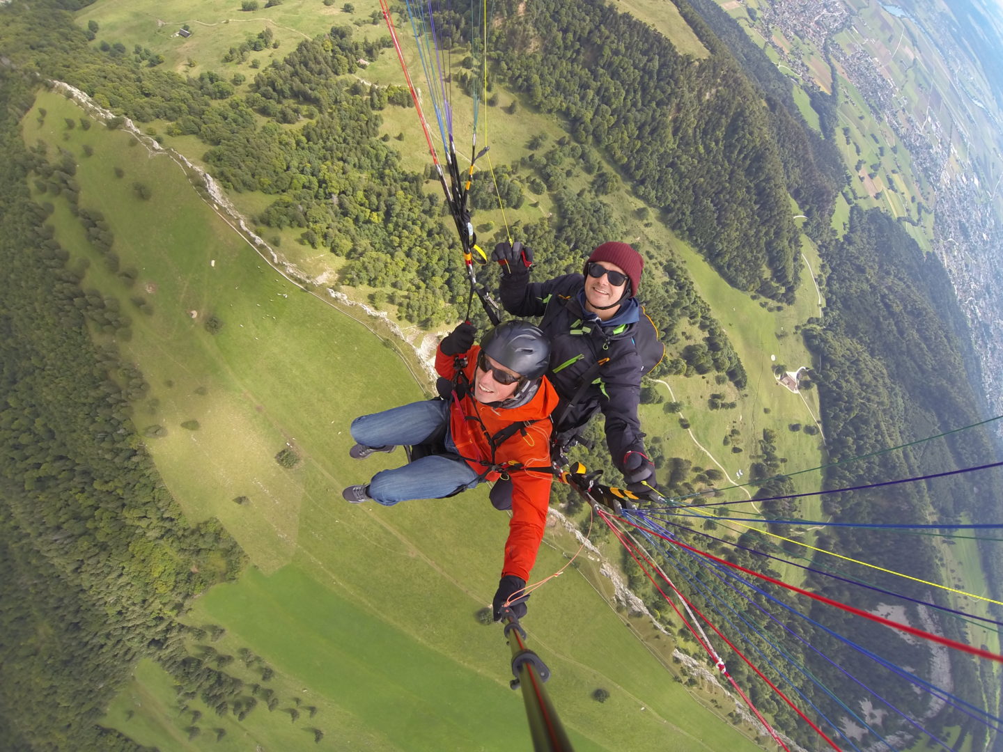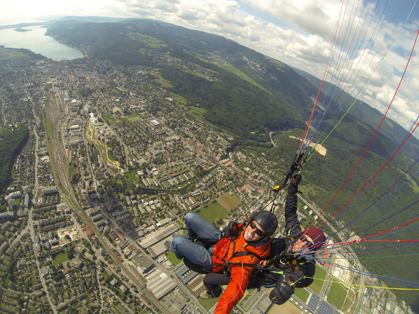 Ein super Erlebnis hatten wir heute am Montoz im Jura. Trotz grossflächiger Abschattung durch viele Wolken konnten wir eine Thermik finden die uns bis auf 2500 Meter über Meer hinauf beförderte. Von da aus hatten wir eine exzellente Aussicht über das ganze Seeland und im Norden bis nach Basel. So macht Tandemfliegen Spass!